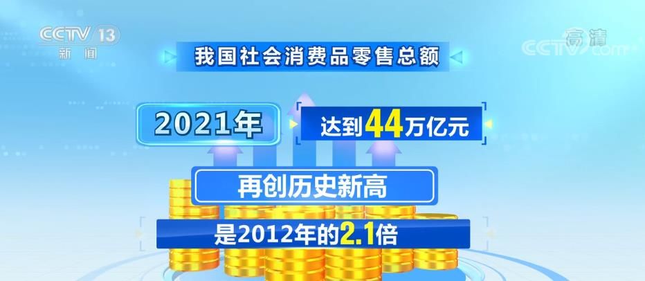 我国消费市场规模持续扩大。2016年、2019年,我国社会消费品零售总额先后突破30万亿元和40万亿元,2021年达到44万亿元,再创历史新高,是2012年的2.1倍。